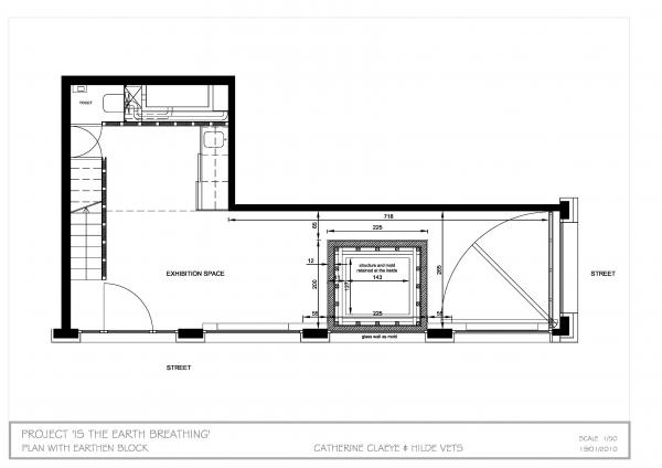 Performance and art project by Catherine Claeyé with technical support by Hilde Vets: "a big cube of rammed earth" would be constructed in the gallery of Pocketroom.