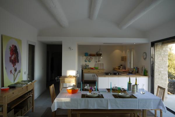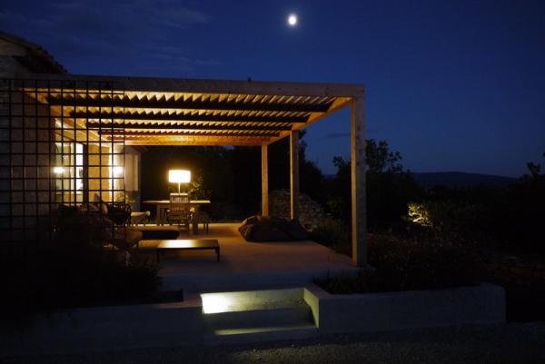 The lamellae of the pergola are placed in the direction of the winter solstice to allow sunlight enter the house (and warm it!) during these dark and cold months. In summer, as the strong sun stands very high in the sky, adequate shade is guaranteed on the terrace and in the house.