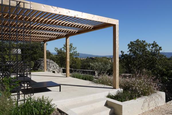 De lamellen van de pergola zijn georiƫnteerd in de richting van de winter zonnestand, zodat het zonlicht tot binnen het huis valt (en het opwarmt!) gedurende deze donkere en koude maanden. Omdat in de zomer de hevige zon zeer hoog in de hemel staat, is er voldoende schaduw gegarandeerd op het terras en in het huis.