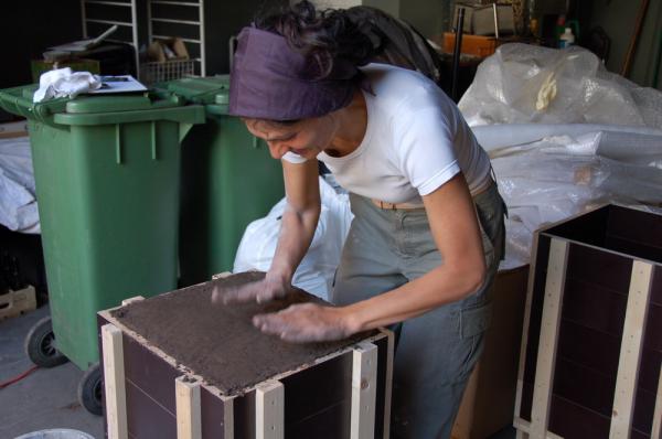 Performance and art project by Catherine Claeyé with technical support by Hilde Vets: "a big cube of rammed earth" would be constructed in the gallery of Pocketroom.