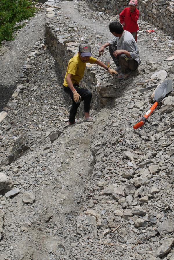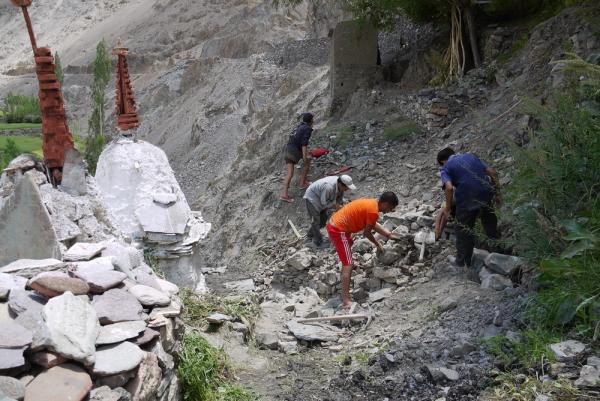 A part of the pathway was repaired and a new water channel was built next to the upper Chörten group, the so- called Harip Chörten group. Minor repairs had to be done at the Kagan Chörten and emergency repairs at some of the adjacent chörten.