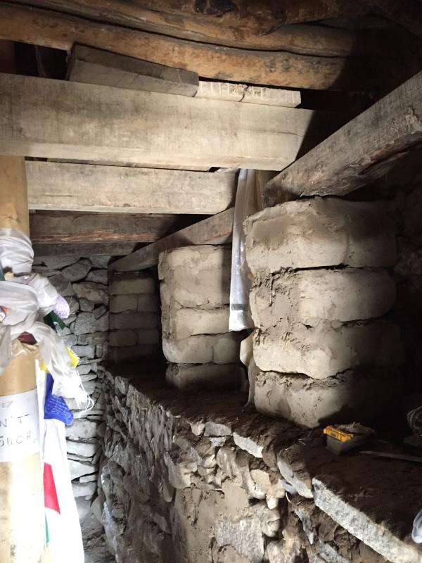The condition of the outside of the upper chörten had worsened over the year. Architect Hilde Vets and a local mason discovered quite some big cracks and holes around the vase and on the steps of the west façade. They were reinforced, filled with stones and covered with a coarse mud plaster.