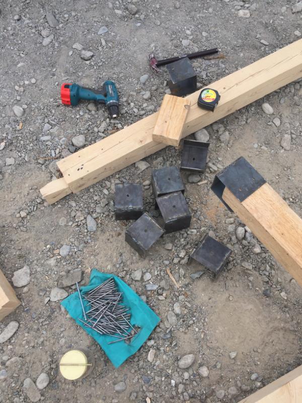 The ring beam was conceived as two wooden beams on each side of the base and fixed together with an adjustable iron connection in the middle. In this way the ring beams were tightened and put under tension. The corners were fixed with corner plates and screws.